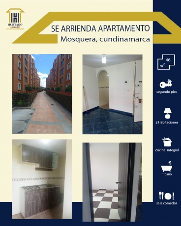 Se arrienda apartamento ubicado en el municipio de Mosquera, Cundinamarca Tiene un área de 46 metros cuadrados. Es un Segundo piso Consta de : 2 habitaciones 1 baño Sala comedor Cocina integral Parqueadero comunal